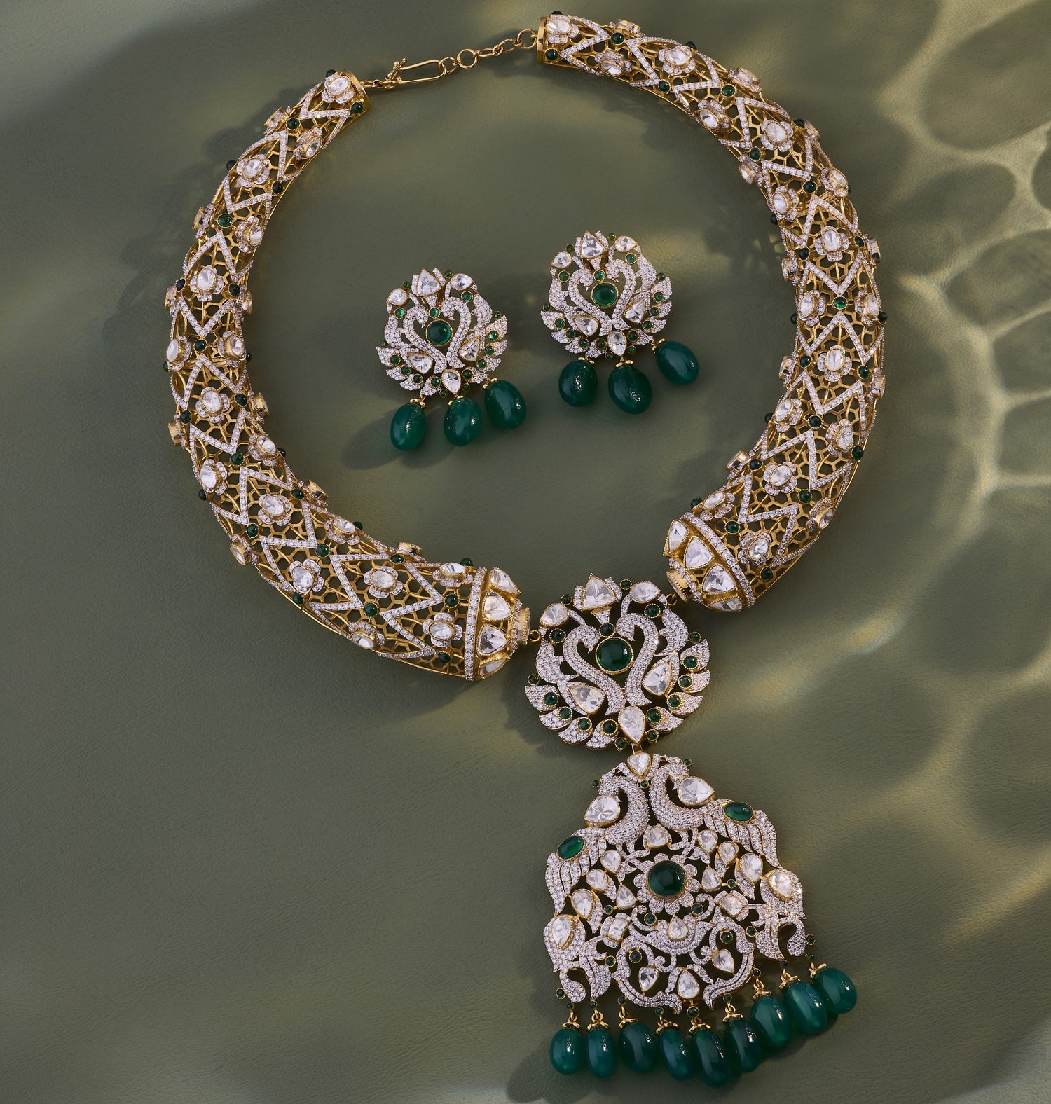 Elegant Rose Gold Diamond & Green Stone Necklace